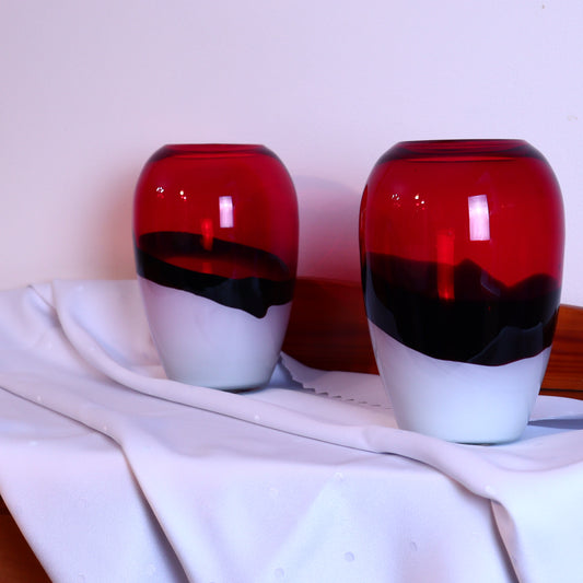 Glass Vases – Pair of Red, Black, and White Murano Vases