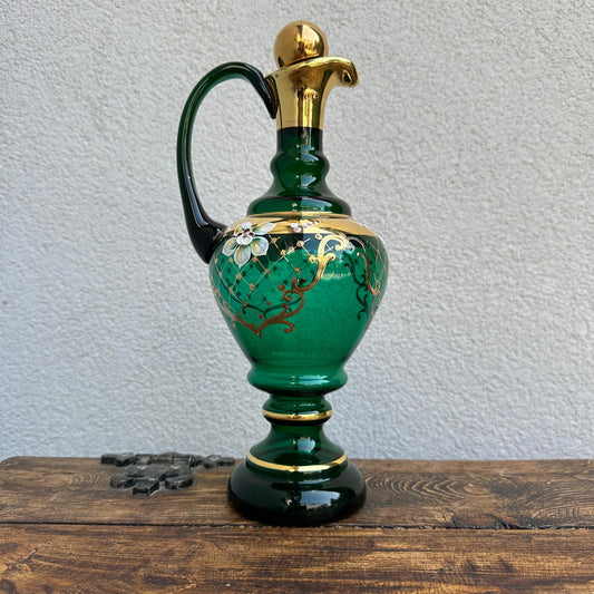 Vintage Green Glass Carafe with Gold Floral Decoration – Bohemia