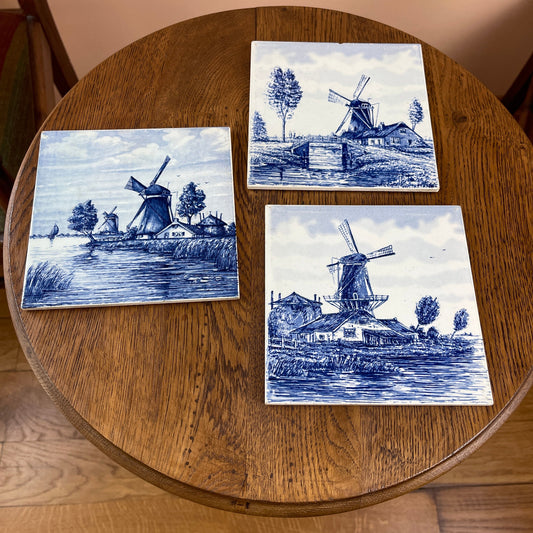 Set of 3 Delft Blue Ceramic Tiles – Classic Dutch Windmill Landscapes