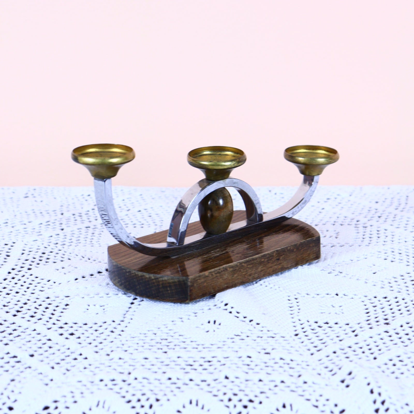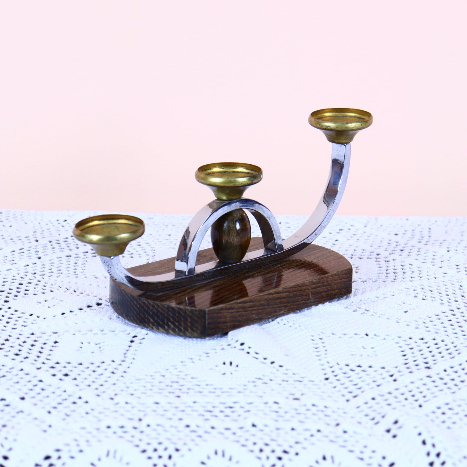 Art Deco Chrome and Brass Candleholder on Wooden Base