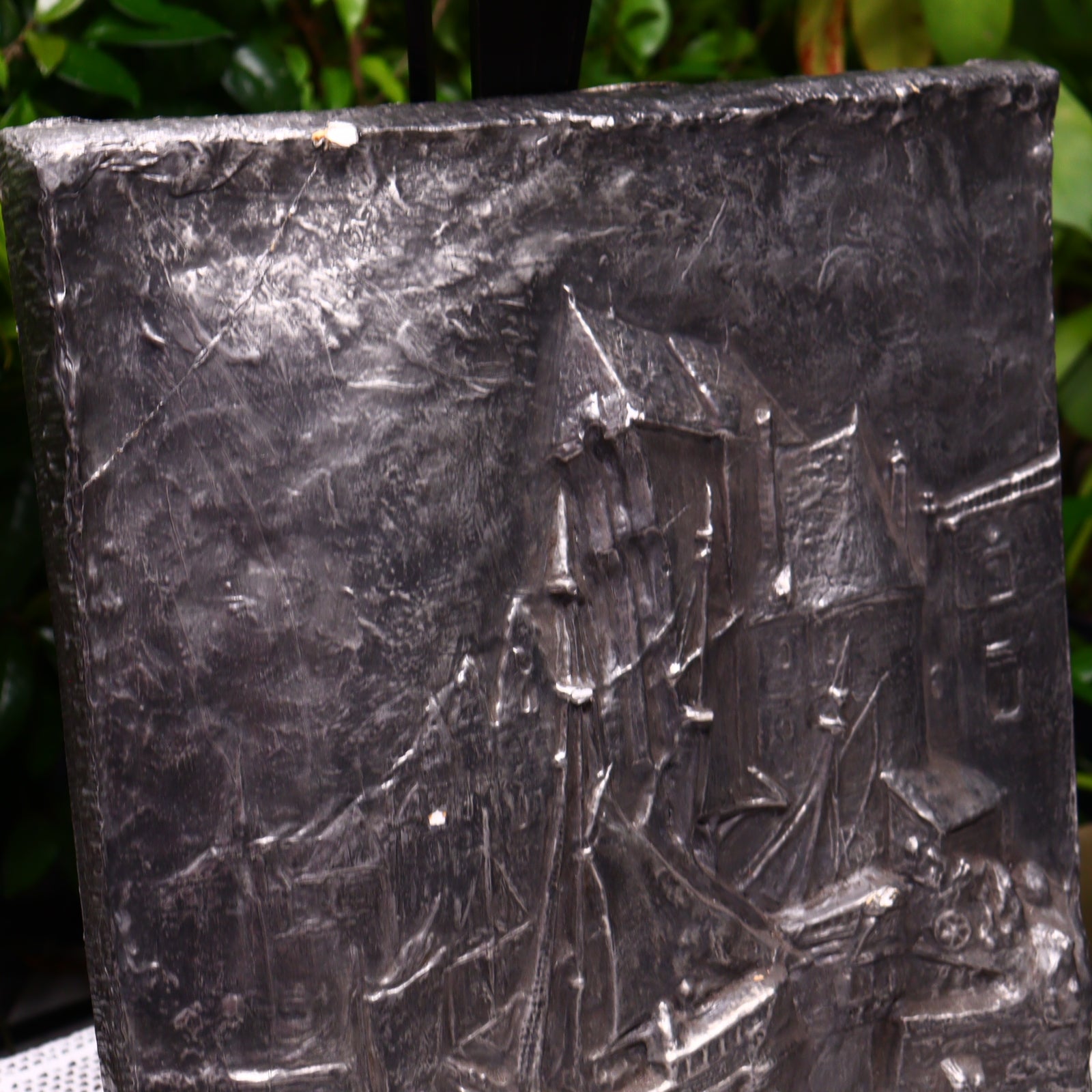 A striking plaster bas-relief depicting a medieval port city dominated by an old crane — specifically the famous medieval port crane in the Polish city of Gdańsk, a symbol of its rich maritime heritage. The detailed scene beautifully captures the atmosphere of historic coastal towns, with weathered textures that add depth and authenticity. This vintage piece exudes timeworn charm and character, showing visible signs of age such as a crack in the upper left corner and small chips in various spots, as clearly shown in the photos. An evocative decorative accent for lovers of architectural history and rustic industrial decor.