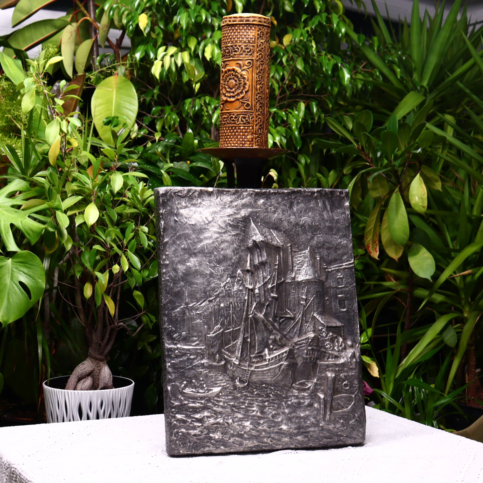 Plaster bas-reliefs like this one were popular decorative elements in the mid-20th century, often used to bring texture and visual storytelling into homes, public buildings, or gardens. Typically made from durable cement or plaster composites poured into detailed molds, these reliefs captured historical or regional motifs in a bold, tactile form. The hand-finishing and aging process gave each piece a unique patina, highlighting the raw surface and depth of the carved scene. Today, vintage bas-reliefs are appreciated as characterful relics of a time when decorative arts merged craftsmanship with local history and urban pride.
