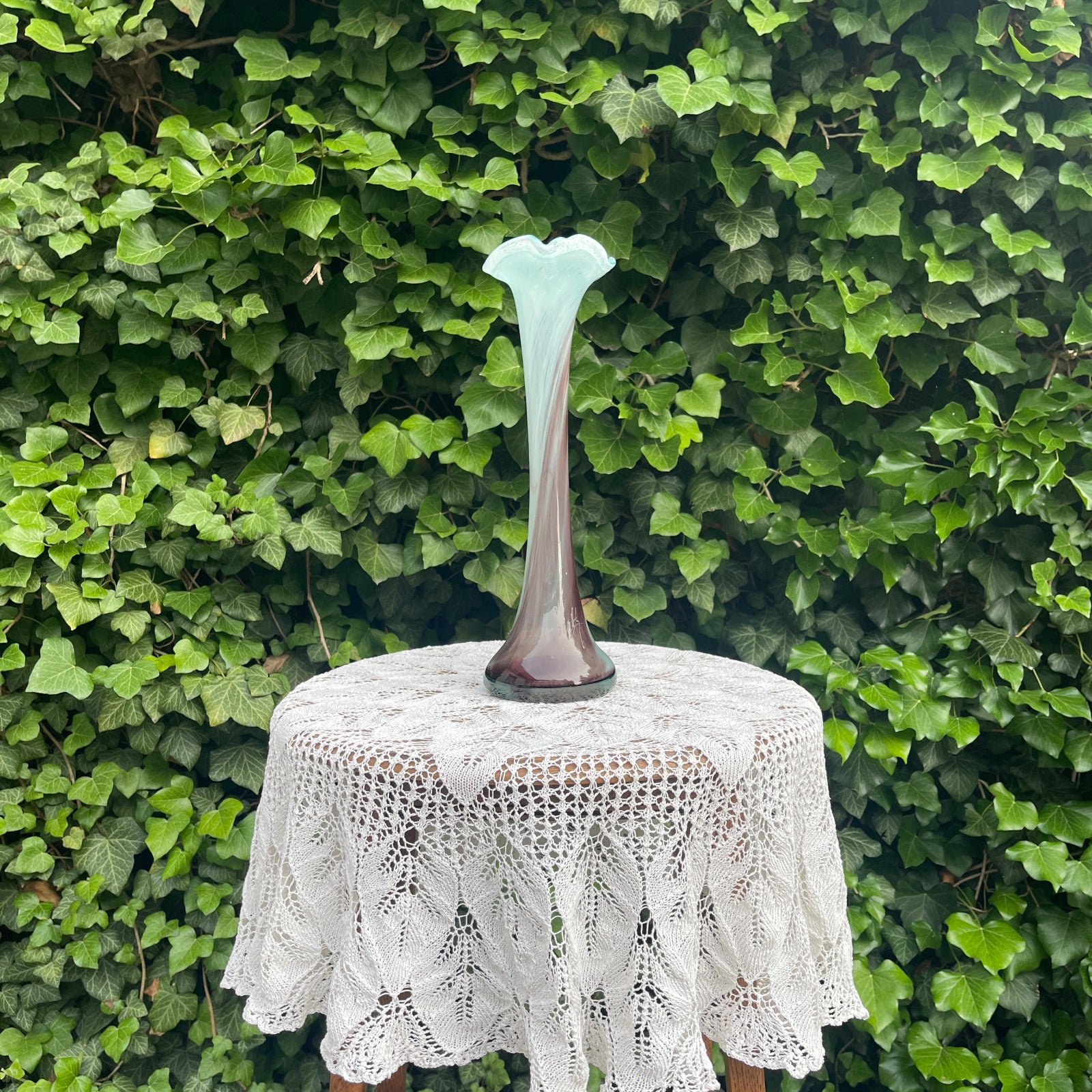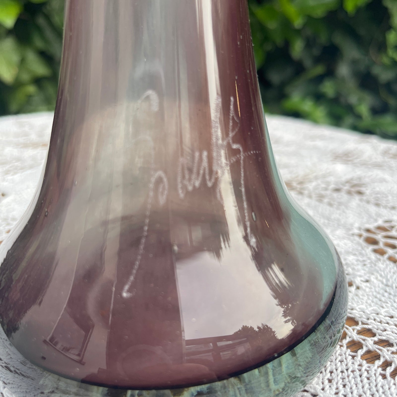 This stunning mid-century handblown glass vase from the renowned Krosno glassworks in Poland captures the essence of modern European glass artistry. Its tall, flared form features a beautiful gradient from smoky plum at the base to pale aqua near the rim, creating a fluid interplay of color and light. The organically shaped opening adds a sculptural quality, making it both a decorative centerpiece and a collectible example of 20th-century Polish craftsmanship. The vase is signed by the artist and remains in excellent vintage condition.