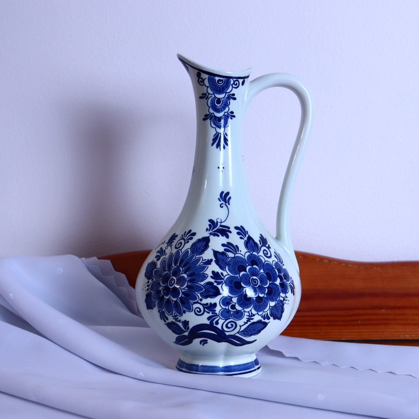 A large Delft-style ceramic pitcher hand-painted with an elegant floral design. Crafted in the Netherlands in the second half of the 20th century, it features a signature on the bottom. Its impressive size and classic design make it a refined decorative piece.