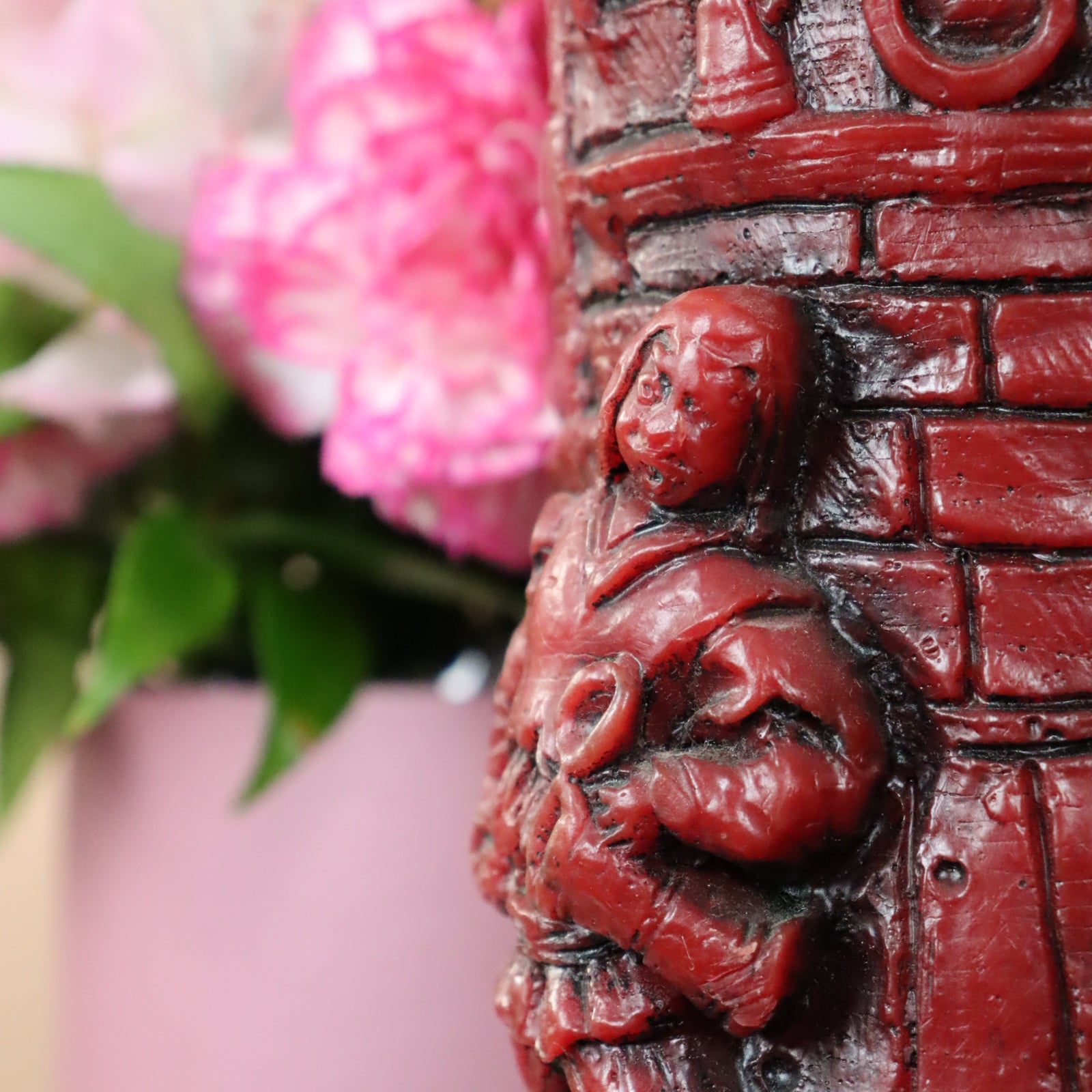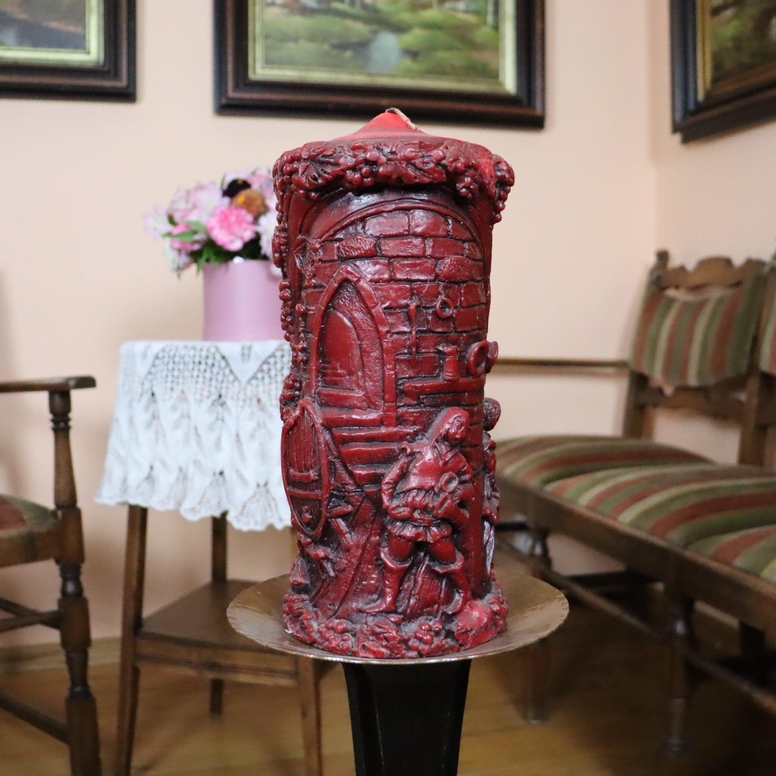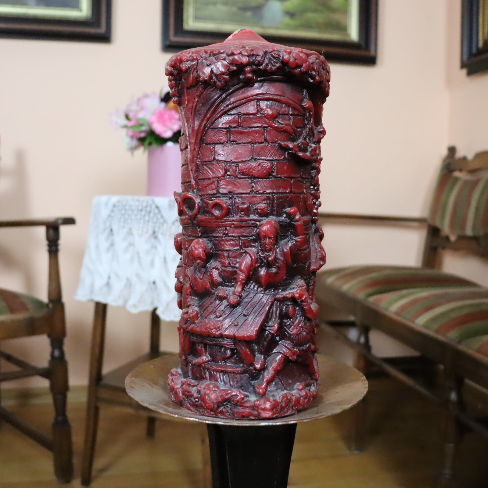 A large, hand-crafted candle adorned with intricate scenes from a bustling medieval inn. Made by Dutch artisans in the mid-20th century, this remarkable piece captures moments of everyday life in finely sculpted relief — from lively conversations to rustic interiors. Both a charming example of folk artistry and an eye-catching decorative accent, it adds a warm, historic atmosphere to any traditional or eclectic space. A true conversation starter that celebrates craftsmanship and storytelling in one unique object.