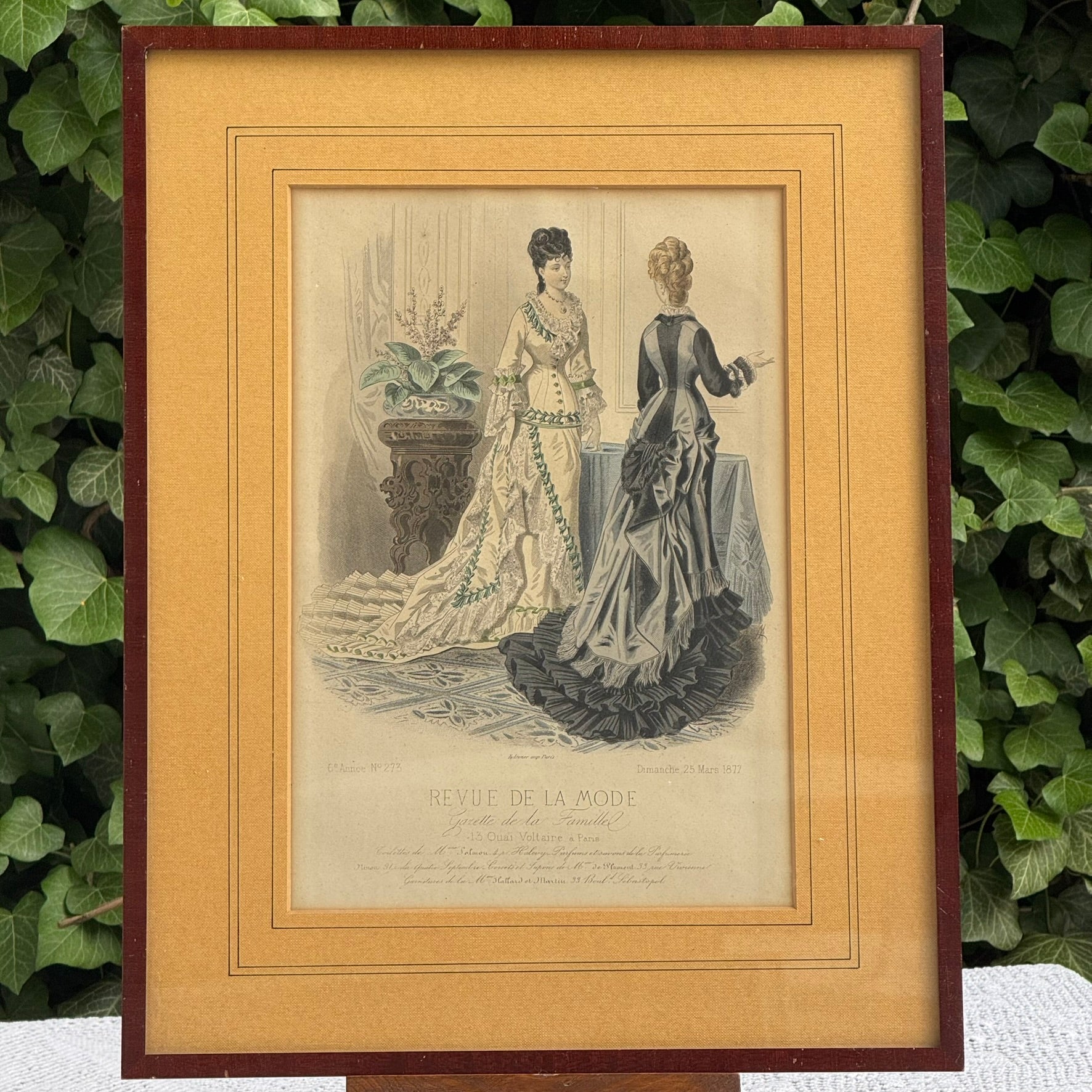An elegant antique fashion print from the renowned Revue de la Mode, dated March 29, 1872. This charming illustration features two ladies in opulent 19th-century gowns, richly detailed with lace, ruffles, and floral trims, captured in a refined interior setting. Such prints were popular in Victorian France as style plates, showcasing the latest trends for fashionable society. The delicate hand-colored engraving is beautifully presented in a warm-toned double mat and a classic wooden frame, ready to adorn any vintage-inspired or eclectic interior with a touch of historical elegance.