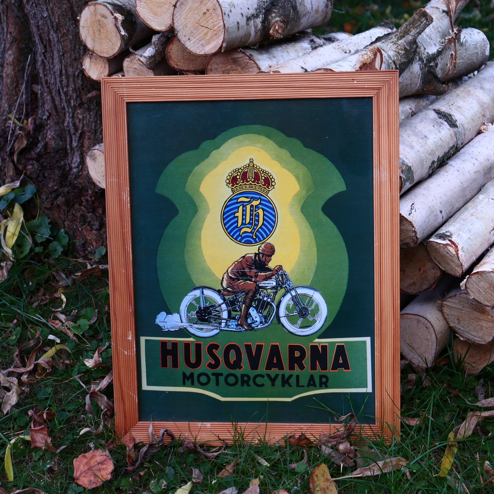 Striking advertising poster from the renowned Swedish company Husqvarna, featuring a dynamic design of a 1930s racing motorcyclist with a bold company logo at the center. Likely portraying factory rider Gunnar Kalén, one of the most celebrated racers of his era, the poster captures the spirit of early 20th-century motorsport. Printed in the second half of the 20th century, it is a perfect collectible for vintage motorcycle or design enthusiasts.