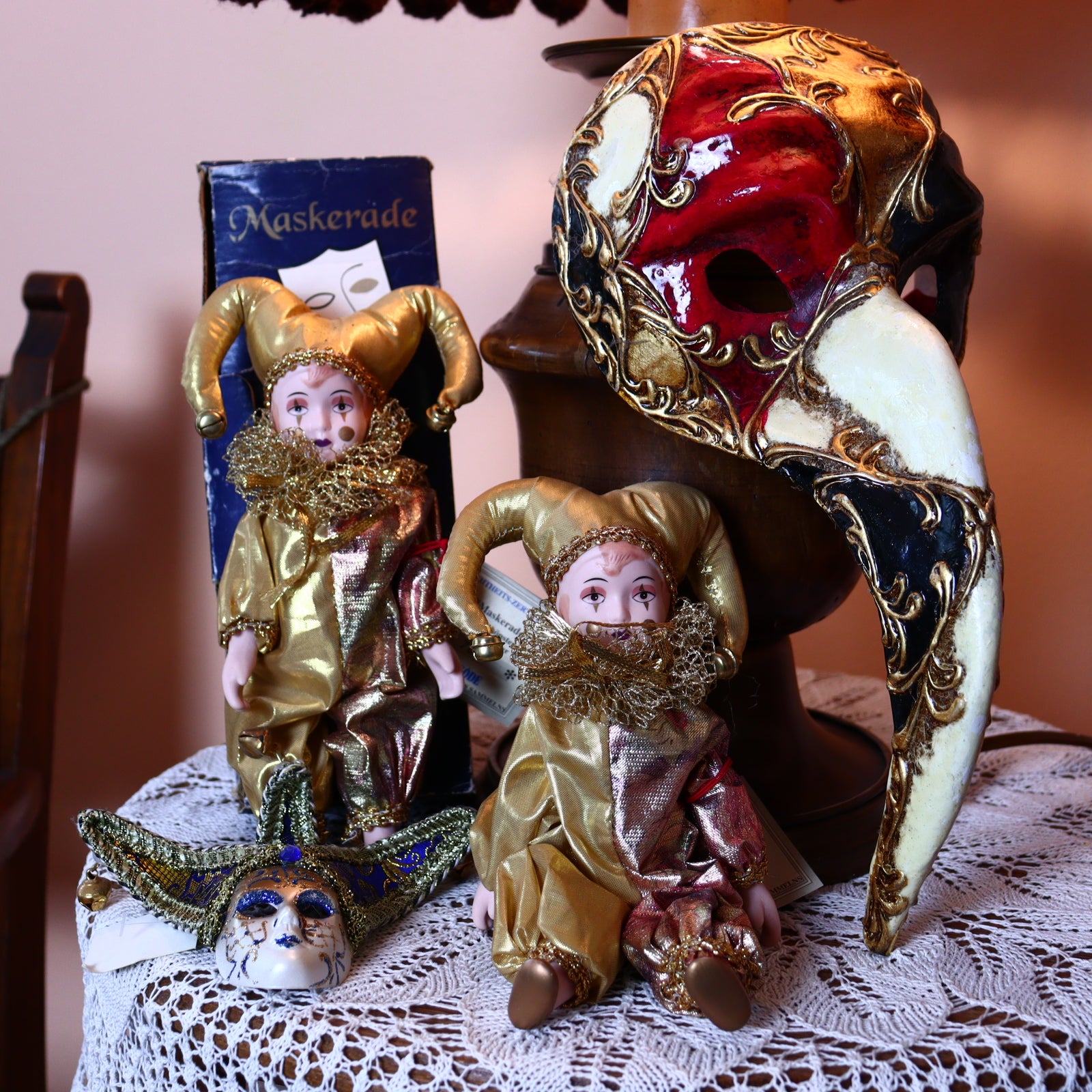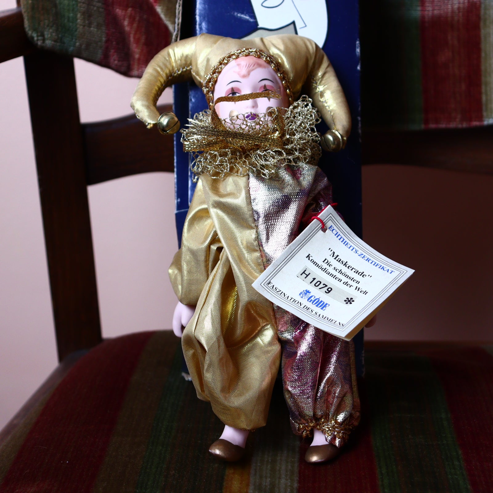 Exquisite collectible porcelain doll with delicately movable arms and legs, dressed in a sumptuous satin costume inspired by the splendor and mystery of the Venetian carnival. This exquisite figurine named Pedro belongs to the sought-after "Maskarade" series by the renowned German doll manufacturer Goede. Rich in detail and old-world charm, it embodies the craftsmanship and theatrical elegance of the masquerade tradition. The doll comes with an original certificate of authenticity (no. H 1079) and has traces of use on the original packaging - a real gem for any collector of beautiful porcelain dolls.