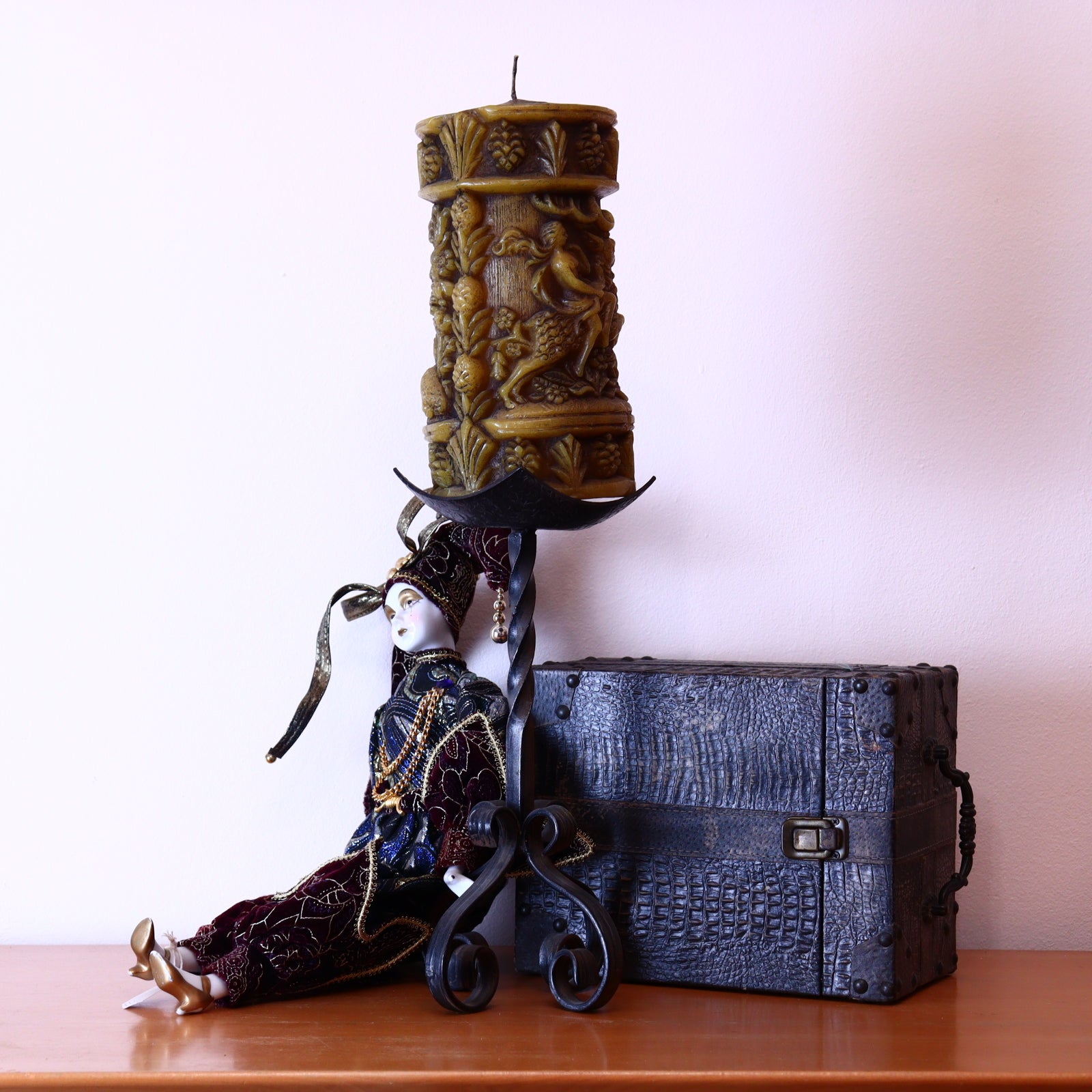The art of crafting decorative candles has flourished in Europe for centuries, evolving from simple tallow tapers to elaborate molded designs for festive and ceremonial use. Especially popular in northern Europe, richly ornamented candles like this one were often handmade to mark special occasions, bringing both light and a sense of artistry into the home.