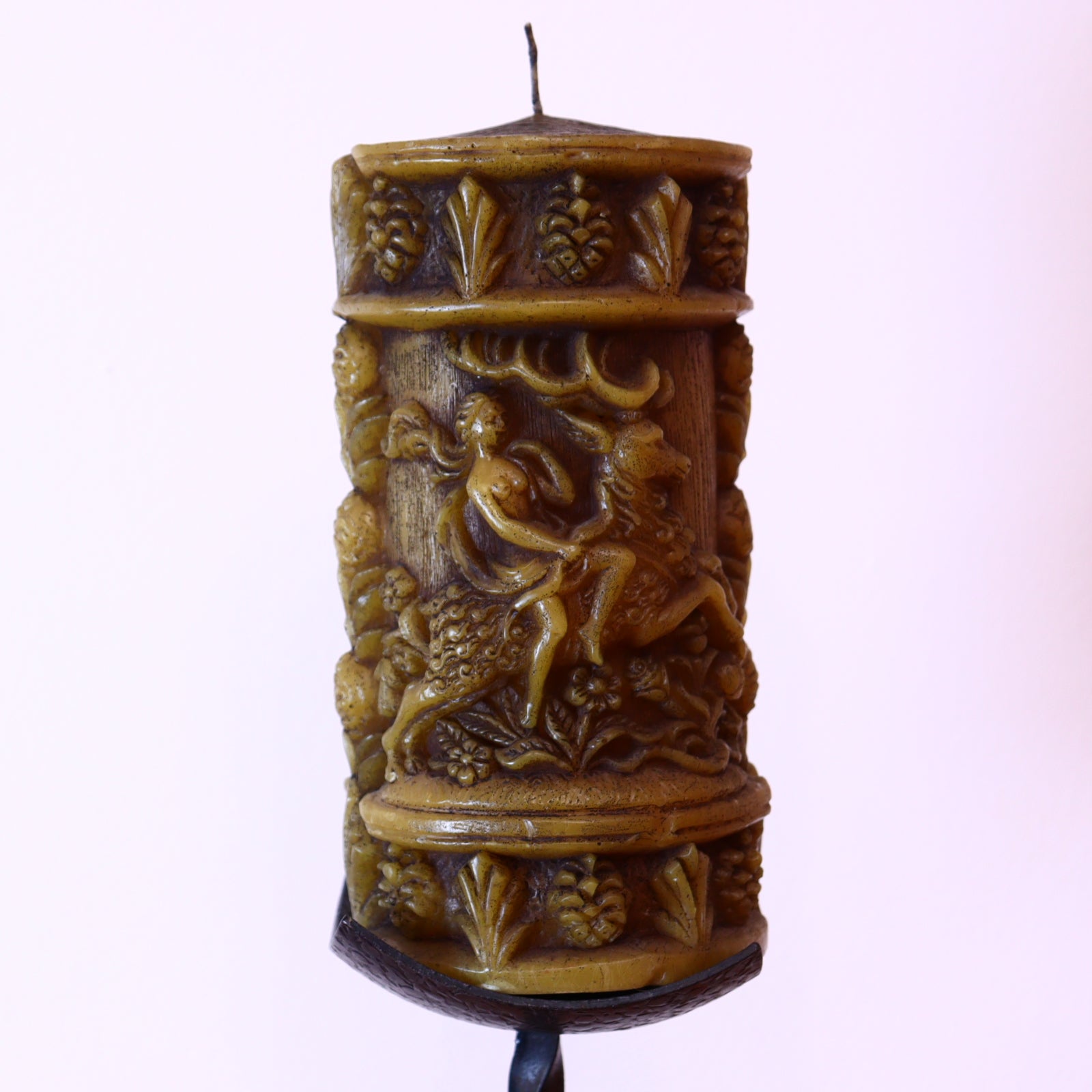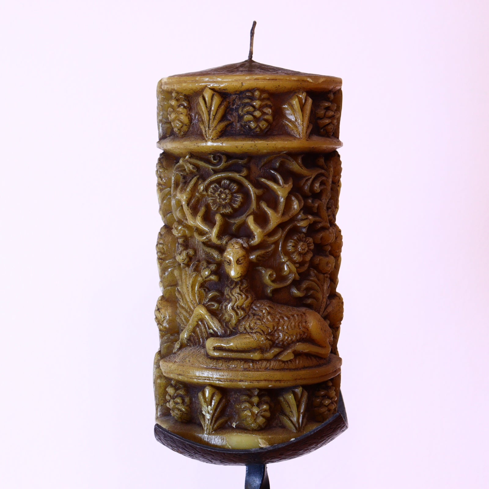 A charming large handmade candle featuring an intricate deer motif, a fine example of mid-20th-century Dutch craftsmanship. The sculpted relief scene wraps around the wax body, bringing woodland charm and rustic coziness to any space. Perfect as a centerpiece or seasonal accent, this decorative candle evokes warmth and nostalgic appeal, ideal for cottage, cabin, or country-style interiors.