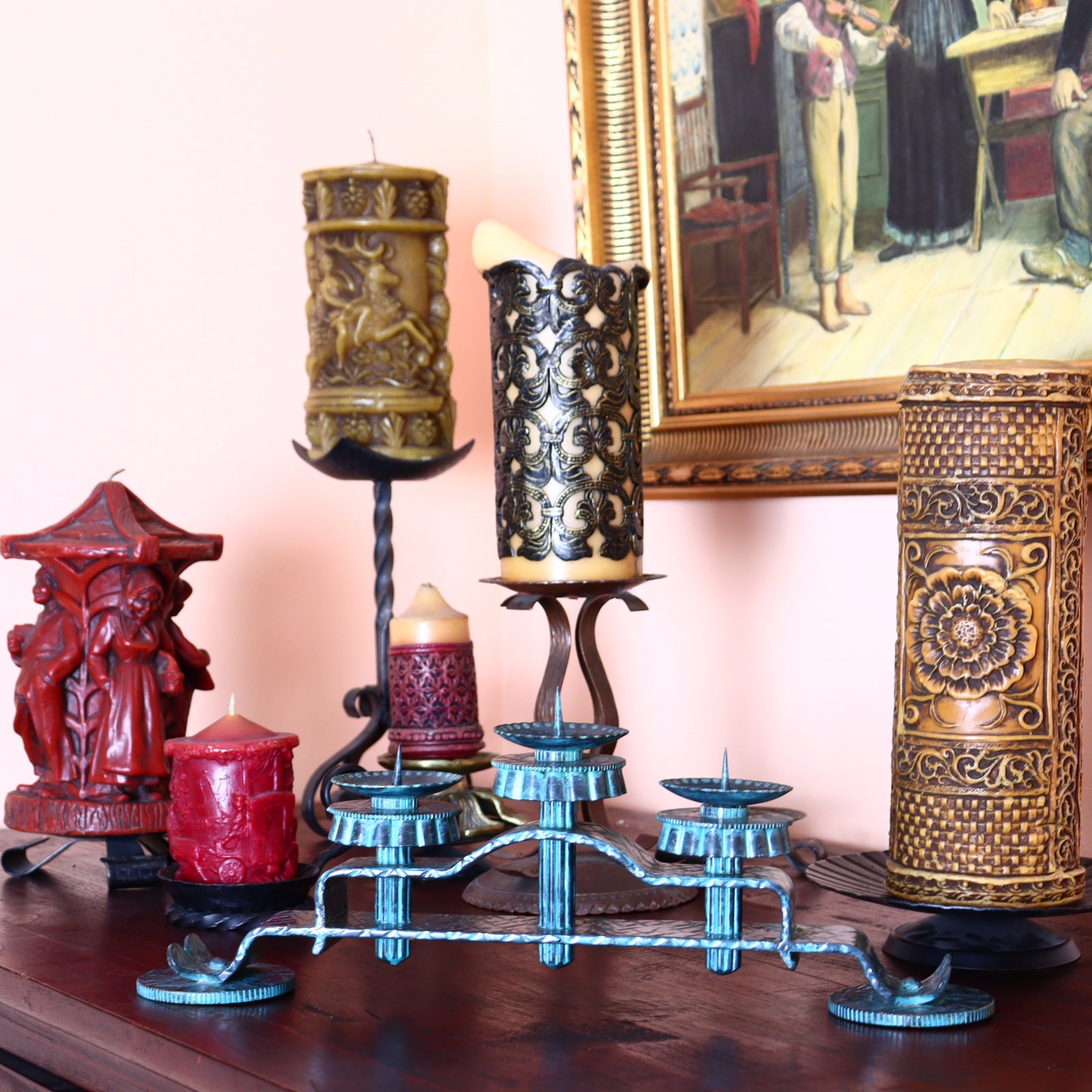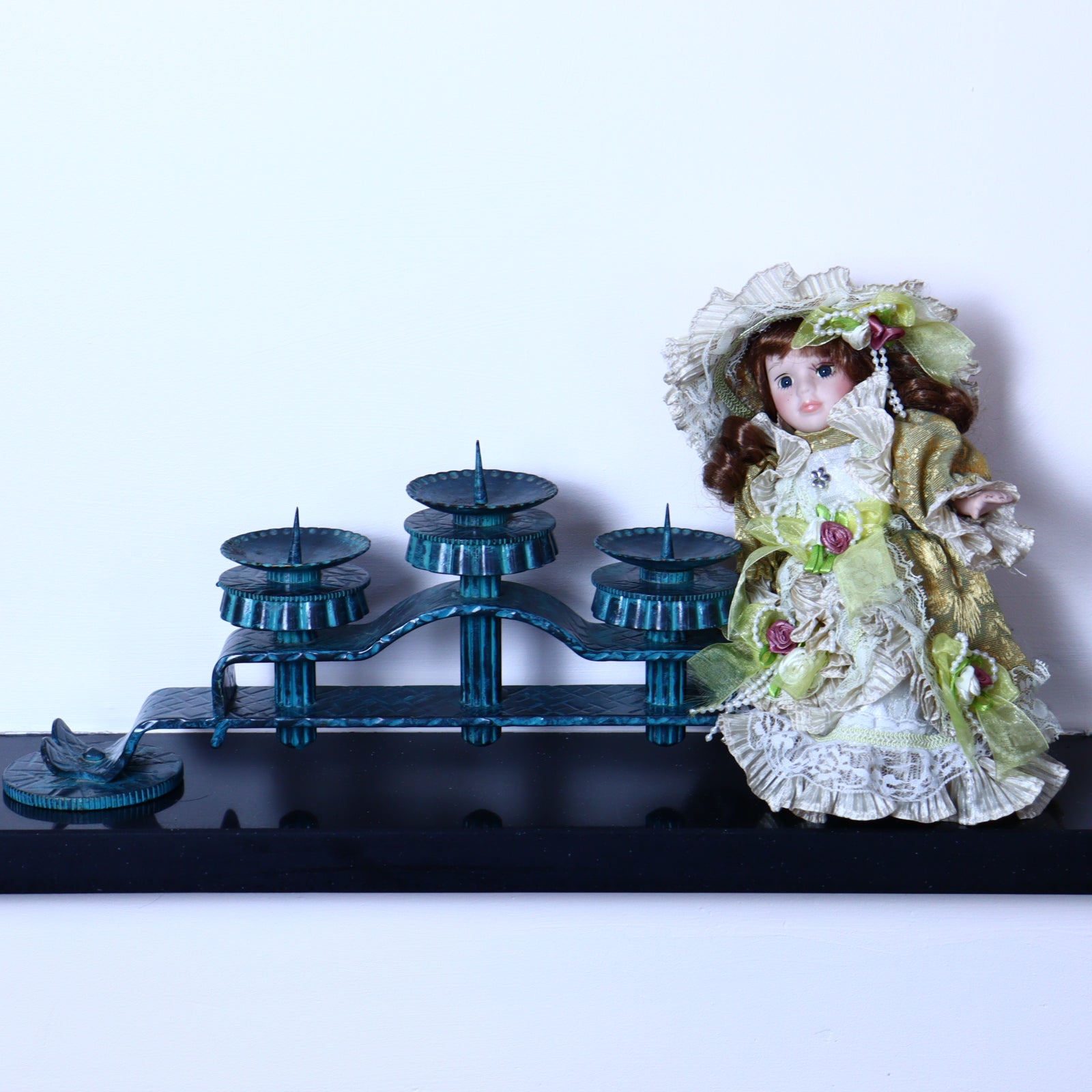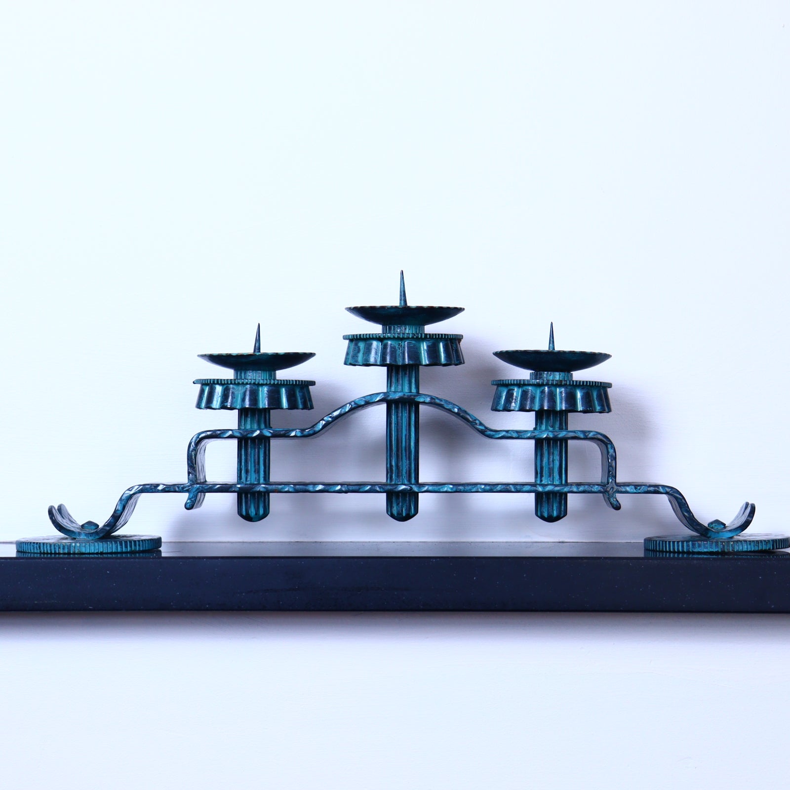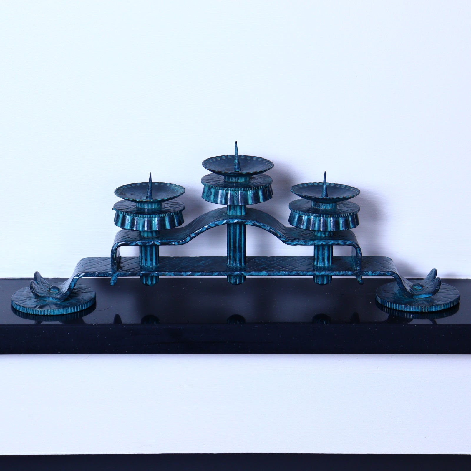 A striking mid-20th-century candle holder crafted from forged steel and finished with a distinctive green patina. The elegant form features gently curved arms and balanced proportions, combining durability with sculptural presence. This refined piece of vintage metalwork reflects timeless craftsmanship and understated beauty, making it equally suitable for rustic, modern, or eclectic interiors. Both functional and decorative, it adds a subtle artistic touch and enduring charm to any setting.