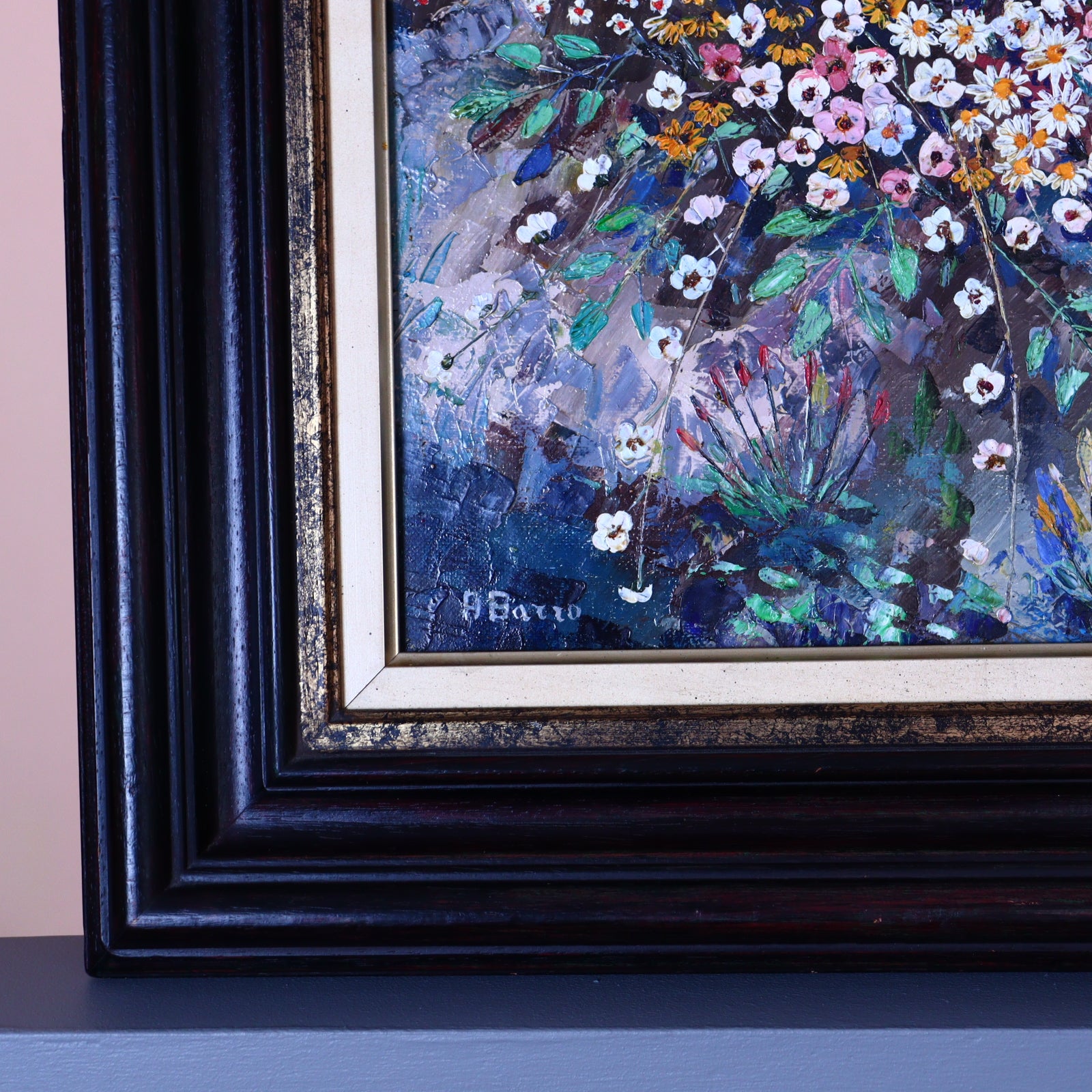 Vintage oil painting on canvas depicting a delicate botanical still life of wildflowers in vivid shades of blue and white. Expressive brushstrokes and harmonious colors create a fresh, joyful energy that recalls a breezy summer meadow. Signed A. Barro in the lower left corner, the piece originates from Italy in the second half of the 20th century. Presented in an elegant wooden frame, this floral oil painting makes a timeless decorative accent and a collectible example of botanical still life art.