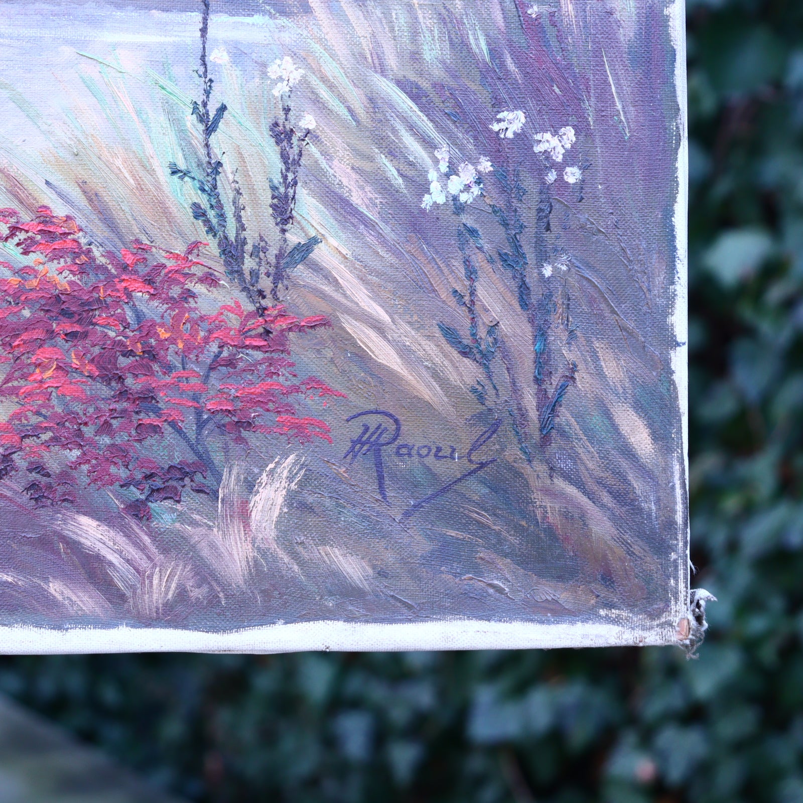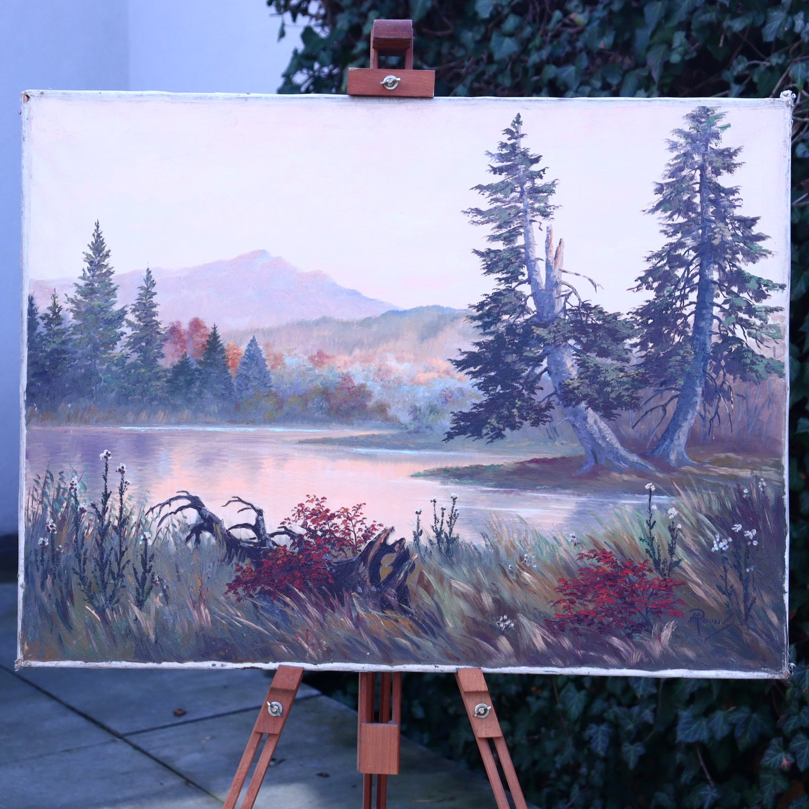 A captivating vintage oil painting on canvas, showing a tranquil lakeside surrounded by distant hills and wooded slopes. The calm reflection of the water, soft light between tree branches, and expressive brushwork create a timeless scene full of depth and atmosphere. Signed “H. Raoul” in the lower right corner, this work reflects the skill of a practiced hand. The unframed canvas shows subtle signs of age, adding character and authenticity. A beautiful example of traditional landscape art that makes a striking piece of vintage wall decor.