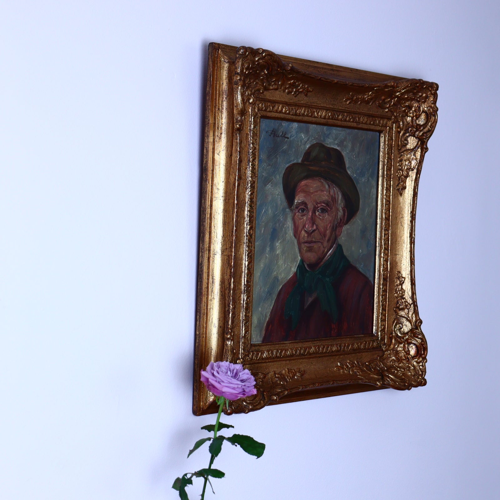 A striking mid-century oil painting on canvas, this vintage portrait captures the quiet intensity of a man in a hat with bold brushwork and expressive detail. The composition conveys both strength and mystery, making it an evocative piece of wall art. Housed in an elegant gold-painted frame, the painting carries undeniable vintage charm. Signed in the upper left corner, it reflects timeless artistry and adds warmth and intrigue to both classic and eclectic interiors.