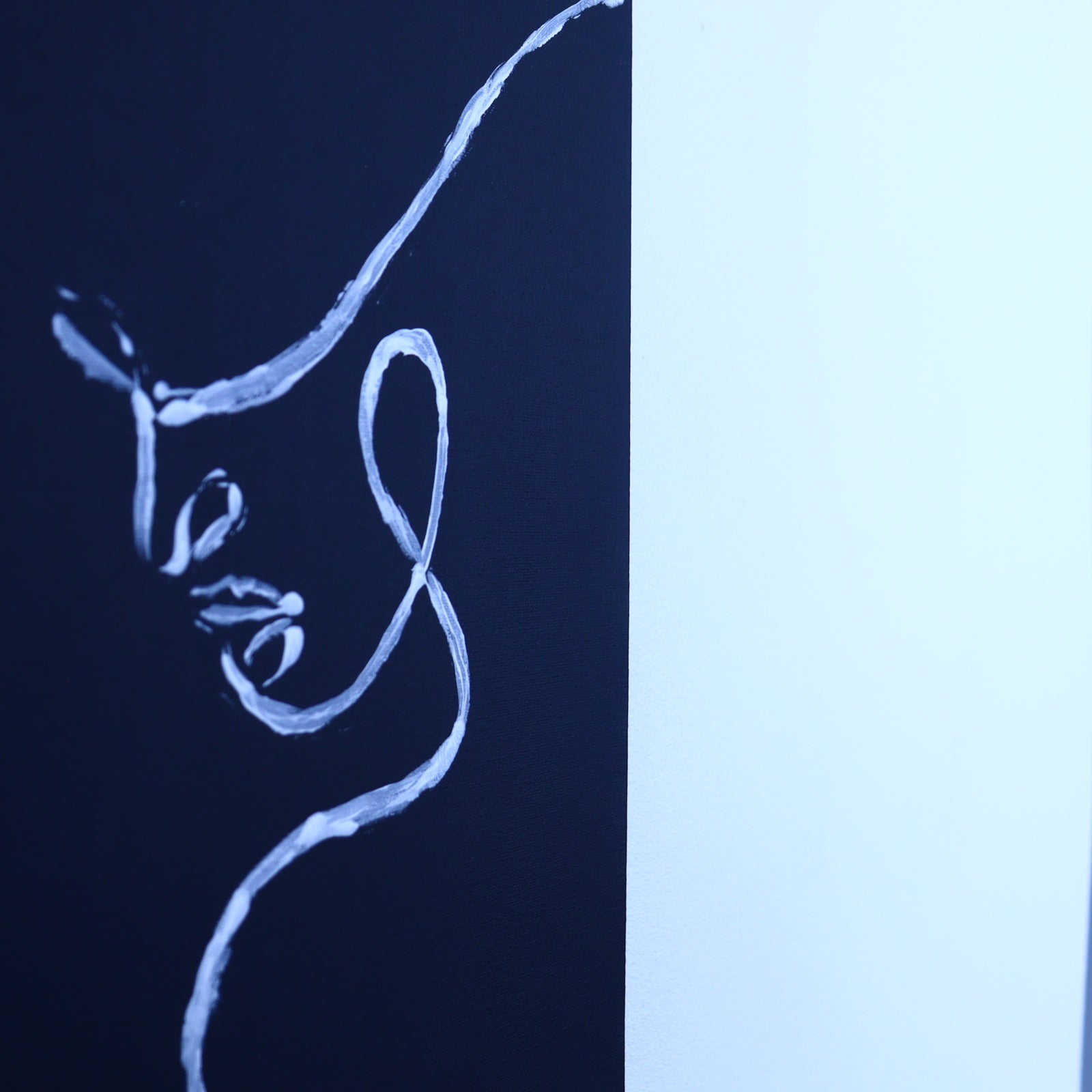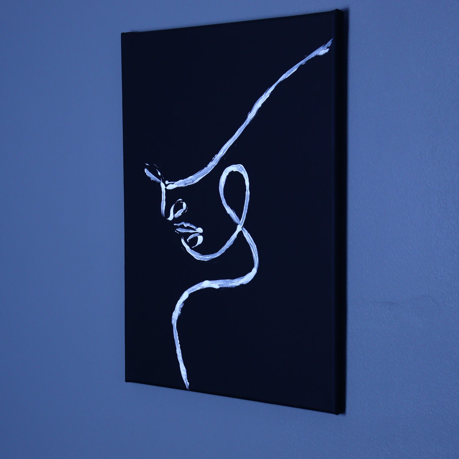 A minimalist yet captivating composition featuring a delicate linear outline of a face set against a deep black canvas. This unsigned piece of contemporary Polish abstraction draws the viewer in with its quiet tension and contemplative character. Its refined simplicity and striking contrast invite moments of reflection, while the bold monochrome palette makes it an eye-catching statement in any modern, curated interior. Perfect for lovers of abstract art and those who appreciate subtle, thought-provoking forms.
