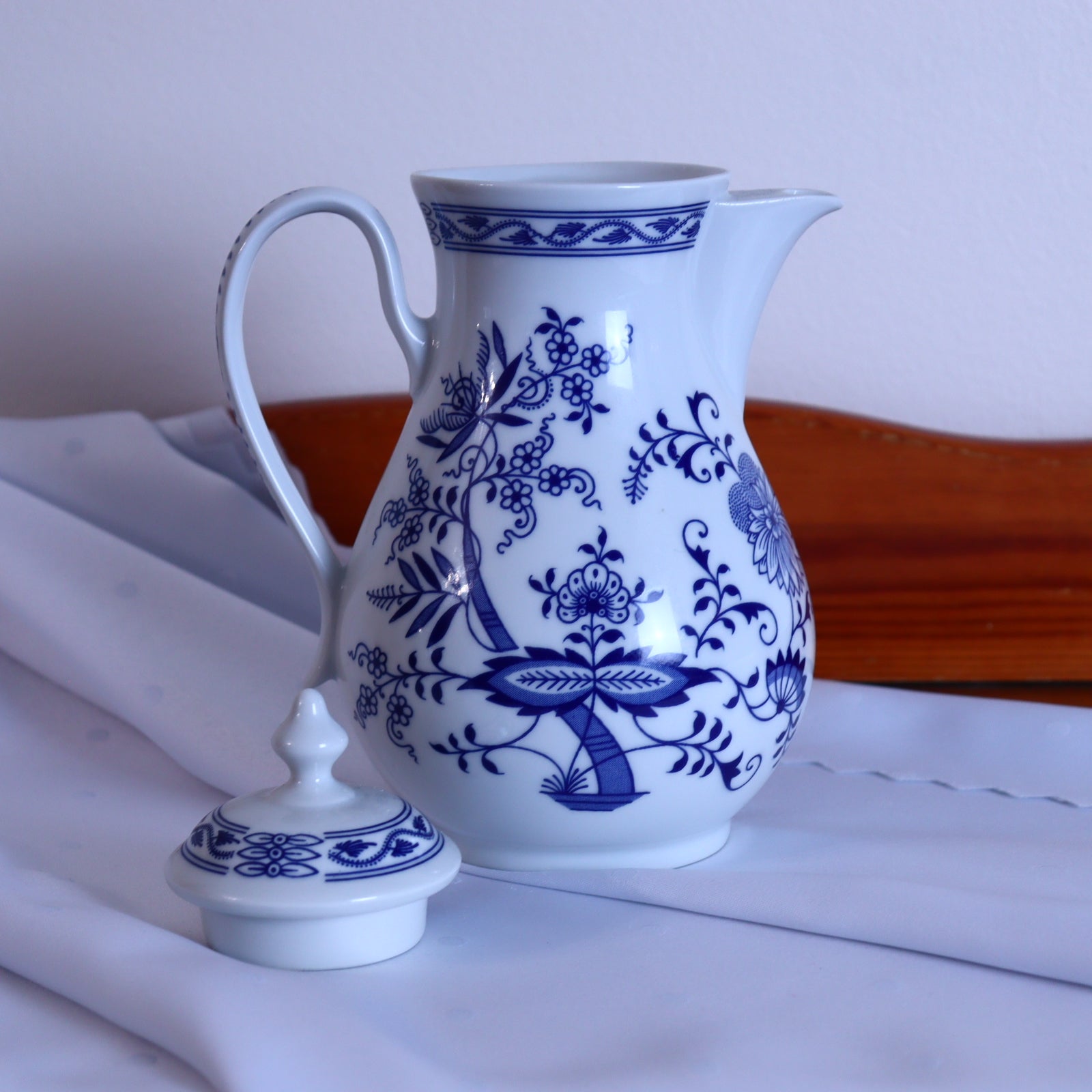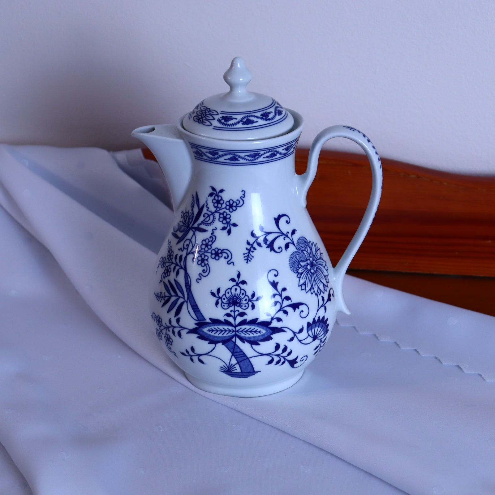 A charming vintage coffee pot from the 1970s, crafted by the Czech porcelain manufacturer Henriette. Featuring the classic Blue Onion pattern in cobalt blue on pristine white porcelain, this elegant piece blends traditional European design with everyday functionality. Its delicate floral motifs, graceful silhouette, and finely modeled spout and lid make it both a practical object and a timeless decorative accent. A signed collectible, perfect for lovers of vintage porcelain or blue-and-white tableware.