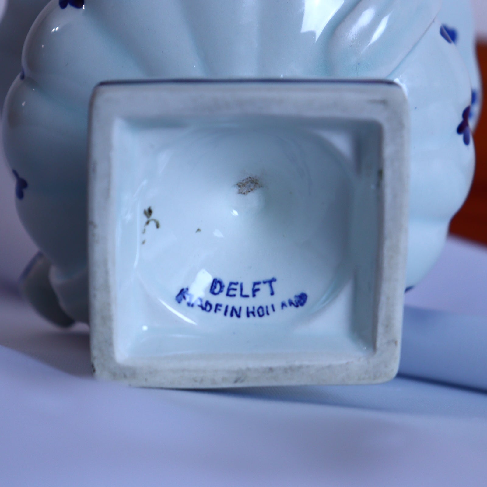 Charming small amphora in the Delft style, decorated with a delicate blue and white floral motif. This decorative ceramic piece reflects the timeless Dutch aesthetic and was crafted in the second half of the 20th century. With its graceful silhouette and traditional palette, it serves as a refined accent for collectors of Delftware or as a tasteful decorative touch for any interior.