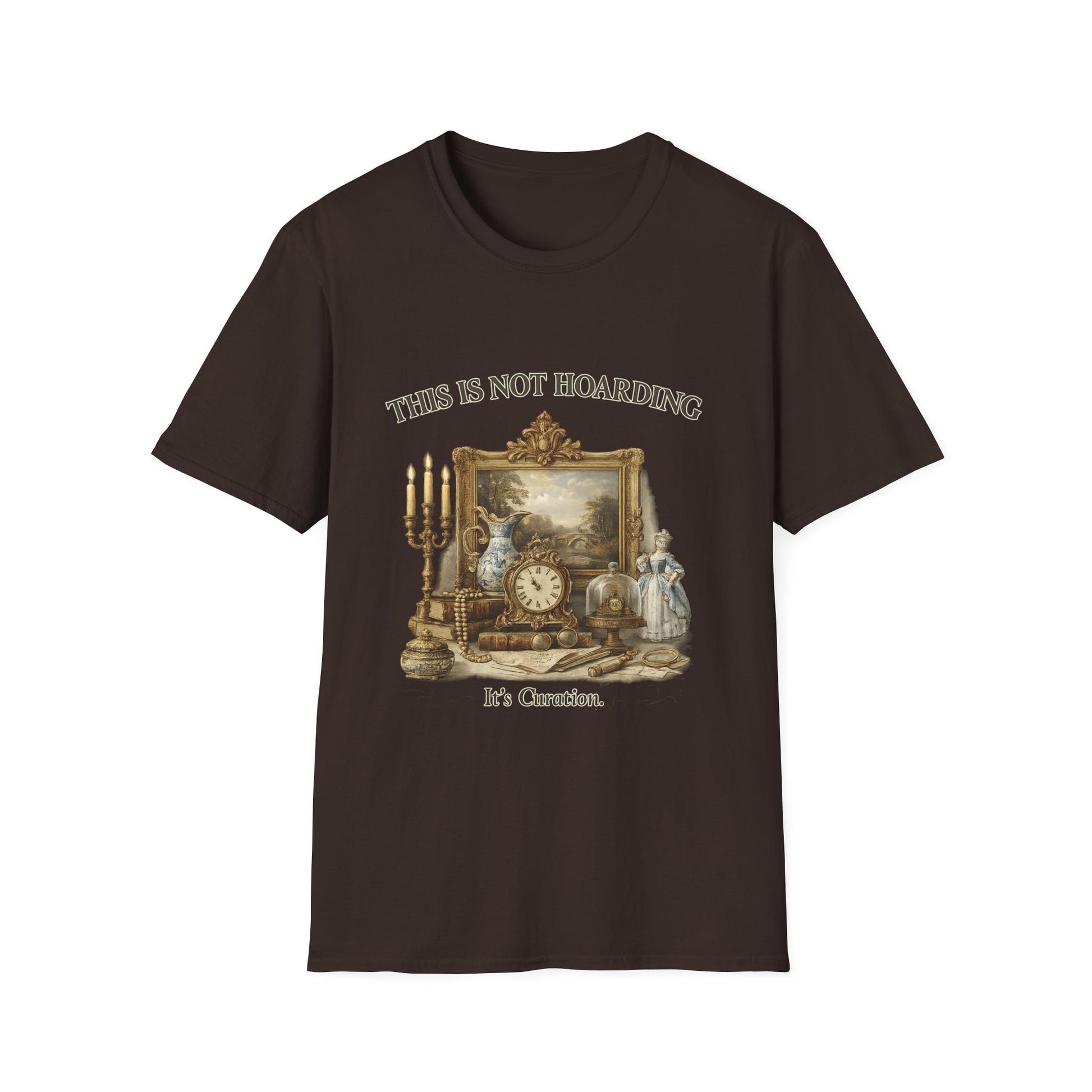 You’re holding a quiet, witty statement shirt that nods to collectors and home curators. Soft, lightweight cotton drapes easily while an antique-inspired print — candlesticks, porcelain, a framed landscape — sits like a small vignette across the chest with the caption “THIS IS NOT HOARDING / It’s Curation.” It reads like someone who values history and stories: worn at flea markets, casual gallery visits, or slow afternoons arranging shelves. The tee’s gentle weight and clean crewneck make it an effortless layer under a cardigan or paired with jeans, so the artwork gets center stage without shouting. It’s for people who love objects with stories and want to show that humor and taste can share the same outfit.