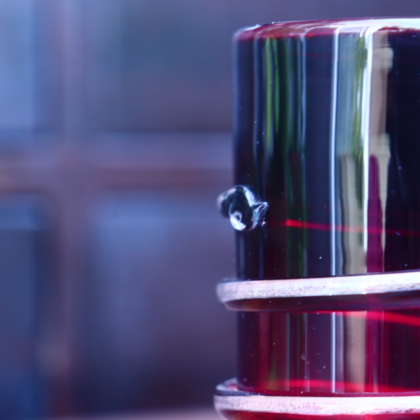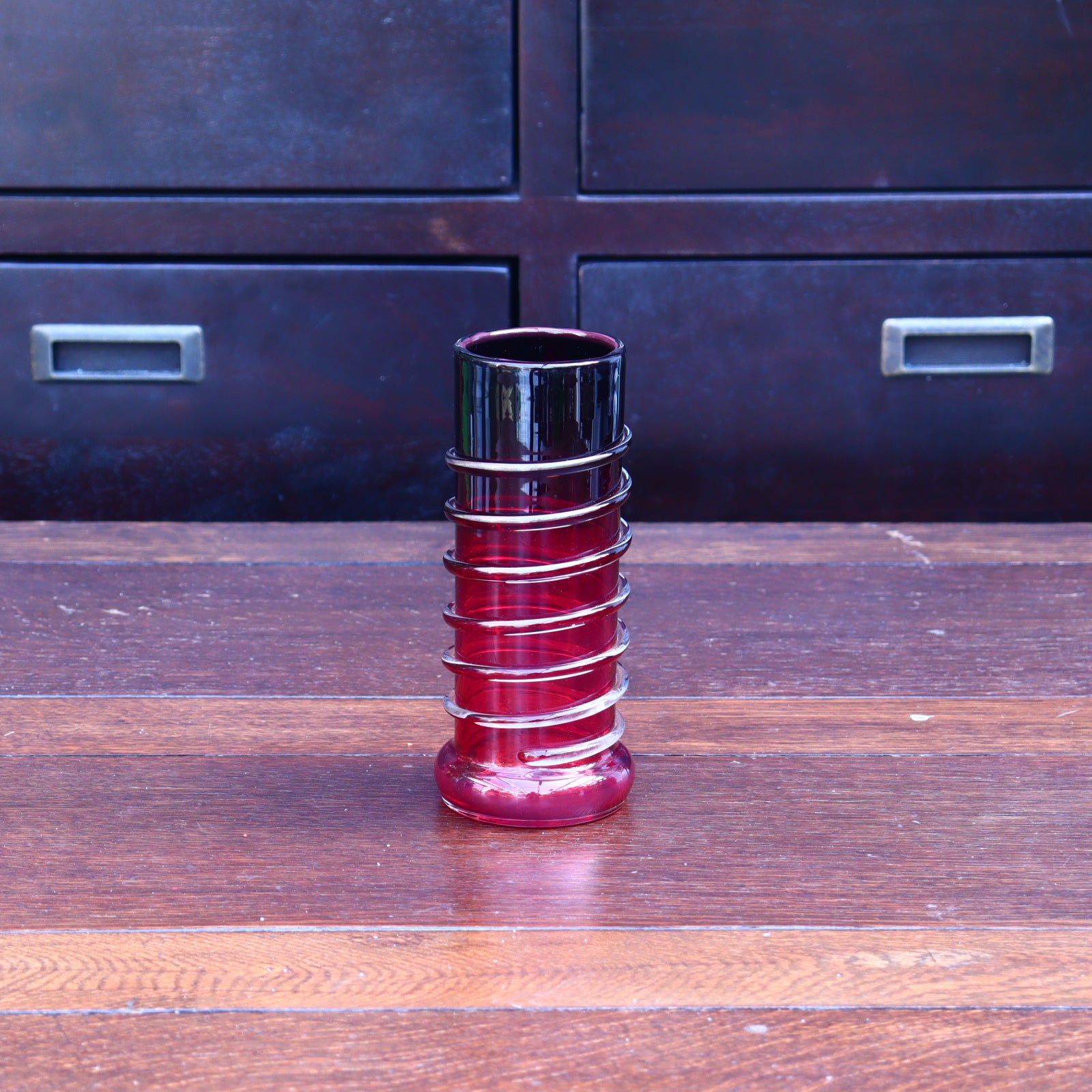 This captivating small glass vase is a striking example of Polish postwar design, created in the 1970s by renowned glass artist Jerzy Słuczan-Orkusz and produced at the Tarnowiec Glassworks. Compact in scale yet rich in expression, the piece features a vibrant ruby red hue that gracefully fades into deep black at the base, creating a dramatic gradient effect that plays beautifully with light and shadow. The bold color palette is masterfully contrasted by a delicate transparent braided handle, applied by hand with exceptional precision and decorative flair. Hand-formed in sodium glass with colored mass, this vase reflects the experimental spirit and craftsmanship that defined the Polish glass design movement of the 1960s and ’70s. Słuczan-Orkusz, known for blending sculptural form with modernist simplicity, brought a sense of individuality and dynamism to utilitarian objects, elevating them to collectible works of art. Elegant yet expressive, this piece serves equally well as a functional vase or a standalone decorative object. A rare find from the Tarnowiec manufactory, it embodies the rich legacy of Eastern European mid-century glassmaking and the artist’s unique visual language—making it an exceptional addition to any curated interior or design collection.