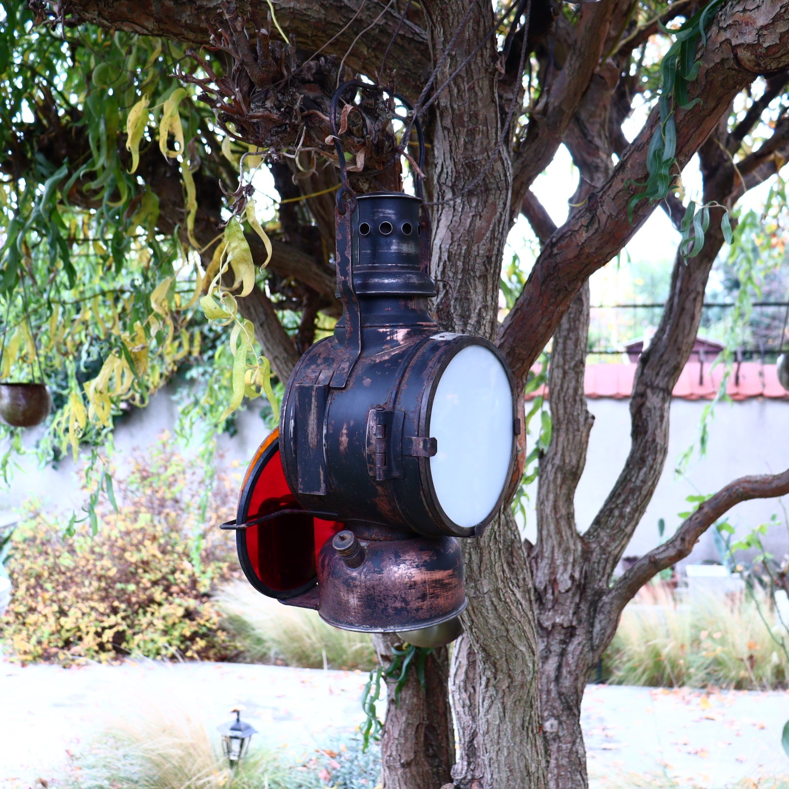 A distinctive vintage oil signal lantern, manufactured in 1968 by VEB Schiffslaternenwerk Ueckermünde in the former East Germany (GDR). Retaining its original factory plate, this robust piece is fitted with a milky white glass dome and comes with interchangeable red and orange acrylic lenses—once vital for railway guard signaling and emergency illumination. Solidly built and true to its industrial origins, the lantern showcases the practical ingenuity and functional aesthetic of mid-century Eastern European design. Today, it stands as a striking historical accent—ideal for collectors of railway memorabilia or lovers of vintage industrial decor.