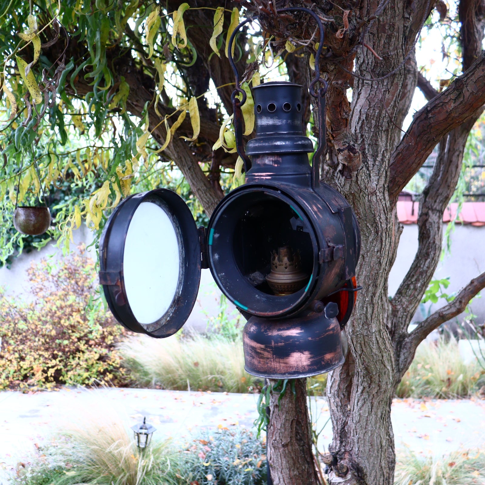 Oil railway lanterns, from the late 19th century through to the mid-20th century, played a vital role in railway safety systems. They were used for signaling, marking wagons and locomotives, and providing portable light for railway workers. Equipped with interchangeable colored filters, these lanterns could convey different messages in poor weather conditions or at night. Their sturdy metal construction and durable glass or acrylic covers made them reliable and easy to handle in demanding outdoor environments.
