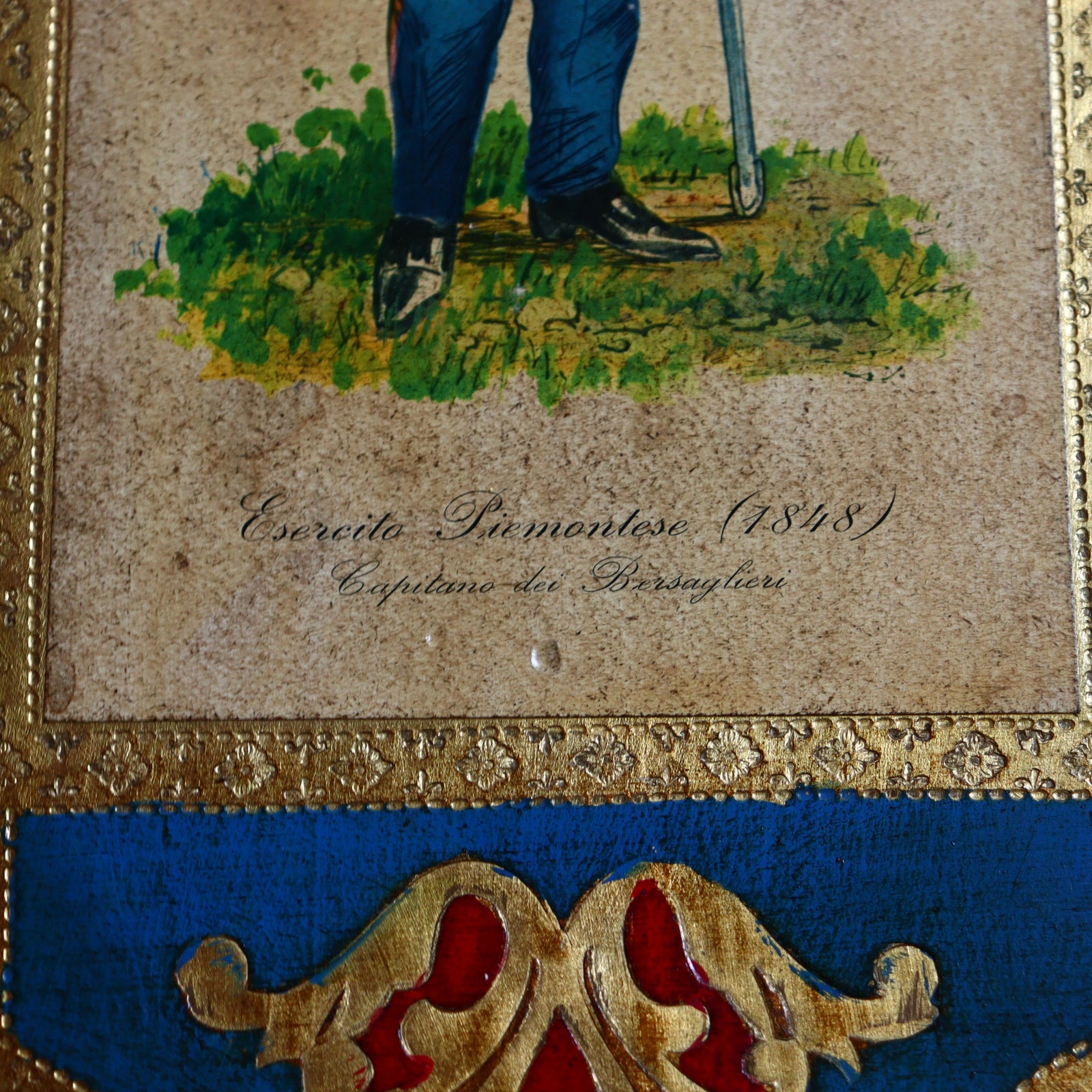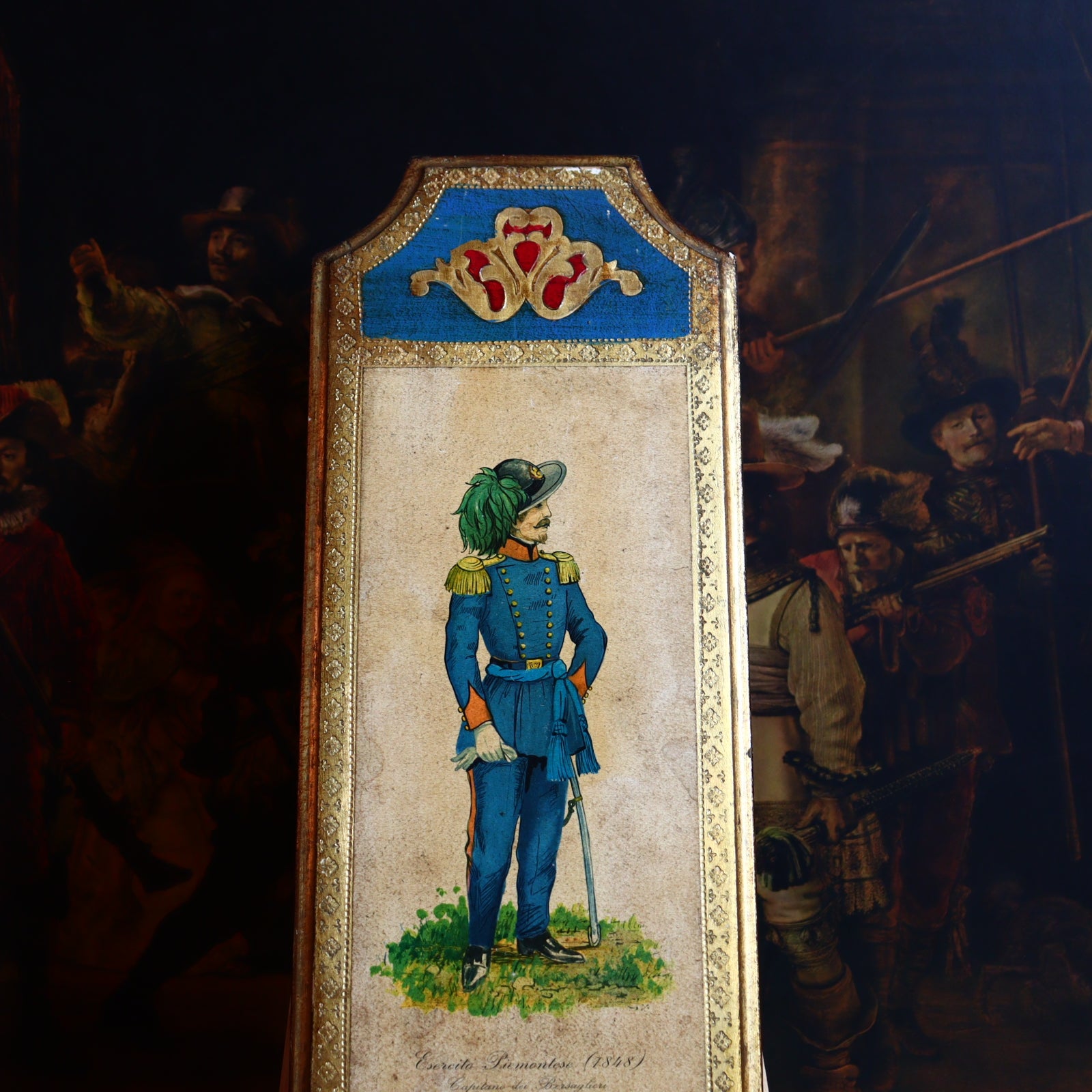 A vintage wooden panel depicting a finely detailed image of a 19th-century Piemontese soldier in full dress uniform. Made in Italy in the second half of the 20th century, this piece beautifully captures the elegance and discipline of historical military aesthetics. The vivid colors and classic design make it an eye-catching accent that brings a touch of European heritage and old-world charm to any traditional or historically inspired interior.